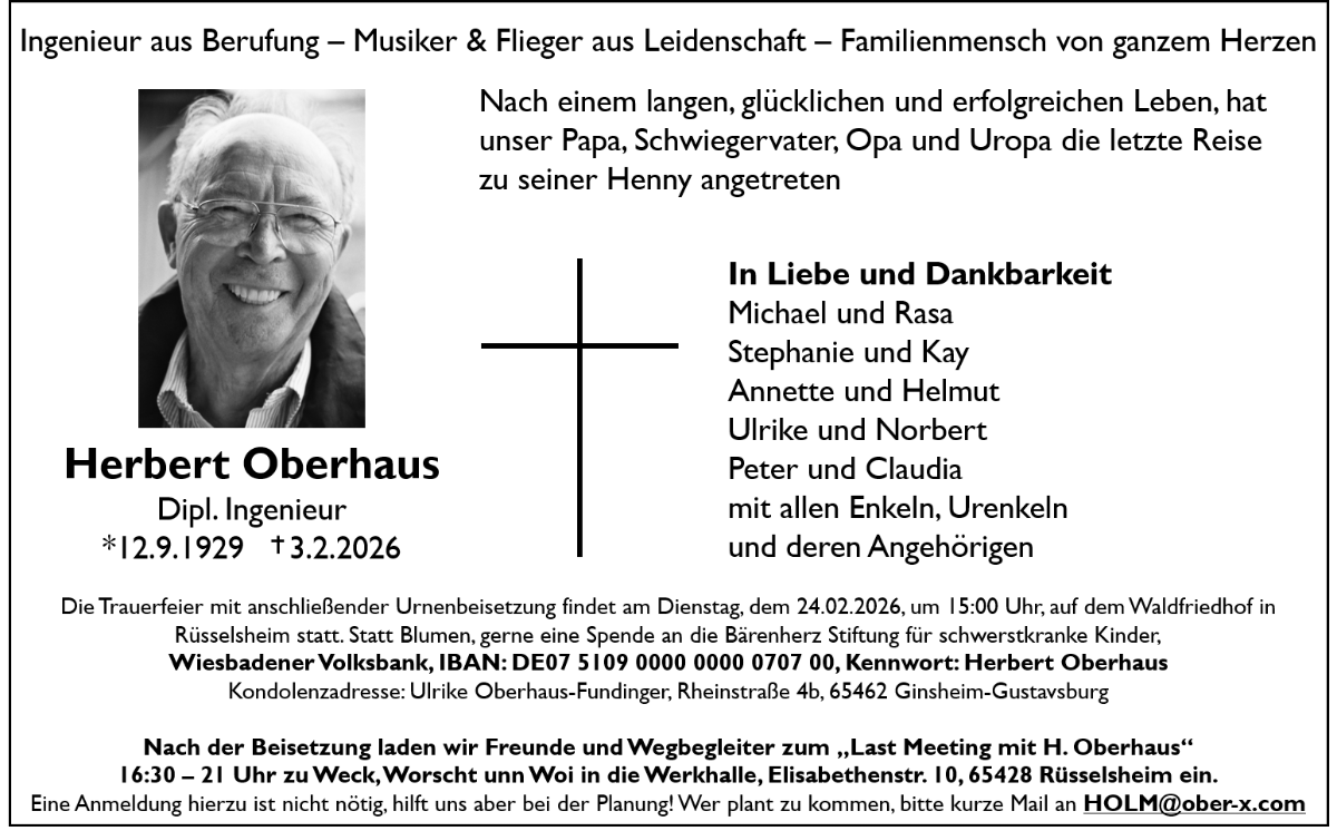 Dipl. Ingenieur Herbert Oberhaus ist am 3. Februar 2026 friedlich in seinem Zuhause in Rüsselsheim eingeschlafen. Er wurde 96 Jahre alt.